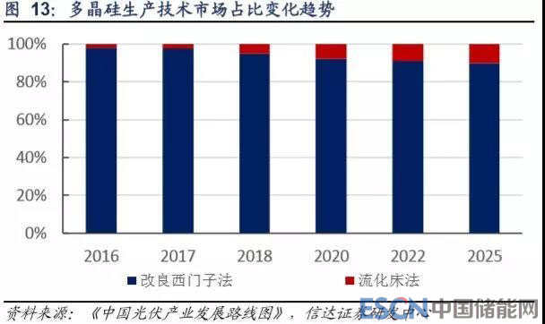 目前全球仍以改良西門子法生產(chǎn)為主,2017 年我國改良西門子法市占率在 95%以上,未來仍將是主流生產(chǎn)工藝,但同時流化 床法生產(chǎn)工藝也不斷受到重視,目前江蘇中能已具備萬噸級硅烷流化床產(chǎn)能,同時全球硅烷法龍頭 REC 與陜西有色合資成立 陜西天宏硅業(yè)從事顆粒多晶硅生產(chǎn),目前正在積極推進。
