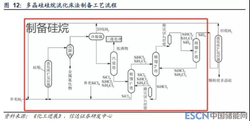 與改良西門子法相比,硅烷法熱解時溫度低,同時流化床反應(yīng)器可增大反應(yīng)面積、提高生產(chǎn)效率,所以還原電耗低于改良西 門子法。另外,由于不需要更換硅芯、配臵碳電極,硅烷法可實現(xiàn)連續(xù)化生產(chǎn)。但是,硅烷法建設(shè)成本高,導(dǎo)致其在綜合成本方面不占優(yōu)勢;另外,硅烷法對安全性要求高,且生產(chǎn)的多晶硅純度較差。目前全球龍頭中主要有挪威 REC 公司采用硅烷法。