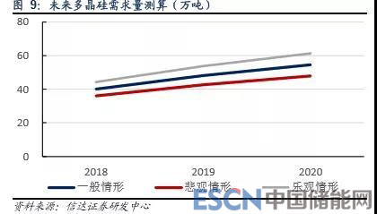 結(jié)果表明,未來全球光伏級多晶硅將保持持續(xù)增長態(tài)勢。一般情形下,2018-2020 年全球光伏級多晶硅需求分別為 40.1、48.1 和 54.5 萬噸;樂觀情形下分別為 44.2、53.7 和 61.1 萬噸。而目前全球萬噸級多晶硅生產(chǎn)企業(yè)產(chǎn)能合計約 47 萬噸,考慮到高 成本產(chǎn)能競爭力下降以及電子級多晶硅產(chǎn)能占一定比例,我們認為目前全球光伏級多晶硅供需相對偏緊。