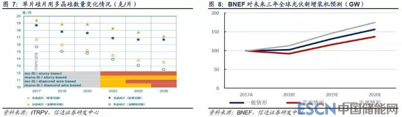 我們根據(jù)國際光伏技術(shù)路線圖(ITRPV)中對單片硅片耗硅量變化的預(yù)計,結(jié)合對未來光伏轉(zhuǎn)換效率的預(yù)計,得出了多晶硅 需求量與光伏裝機量之間的換算關(guān)系。根據(jù) BNEF 預(yù)計,2018-2020 年,一般情形下全球光伏裝機為 103、131 和 156GW, 樂觀情形下為 113、147 和 175GW。我們根據(jù)以上數(shù)據(jù)對未來全球光伏級多晶硅需求量進行簡單測算。