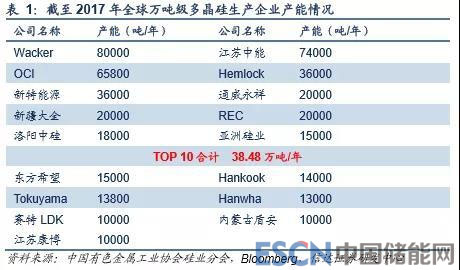 據(jù)我們統(tǒng)計,截至 2017 年底,全球多晶硅生產(chǎn)企業(yè)中,產(chǎn)能達到萬噸級以上的不足 20 家企業(yè),其中瓦克、江蘇中能和 OCI 分別擁有 8.0、7.4 和 6.58 萬噸,位于行業(yè)前三位,行業(yè)前 10 企業(yè)合計擁有產(chǎn)能 38.48 萬噸,市場集中度較高。至 2017 年 底,我國在產(chǎn)多晶硅企業(yè)有 22 家,同比增加 5 家,有效產(chǎn)能共計 27.6 萬噸/年,同比增長 6.6 萬噸/年。