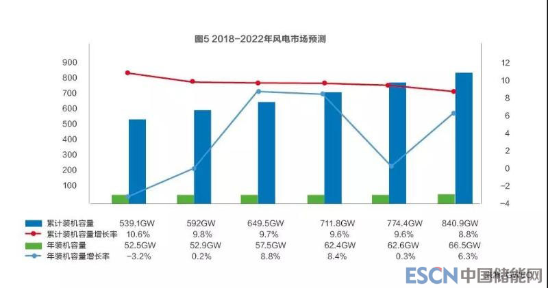而根據GWEC《2017年全球風電發(fā)展報告》對2018-2022年全球風電市場的預測,2018年全球風電市場將基本保持在2017年的水平,2019年和2020年全球風電市場恢復增長,21世紀20年代初將再次突破60吉瓦;到2022年底,累計風電裝機容量總量將達到840吉瓦。(見圖5)