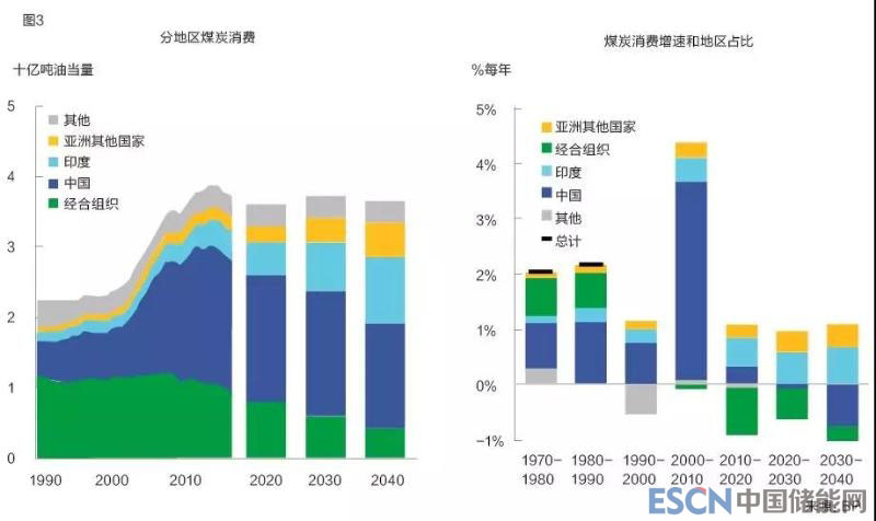 BP認為,煤炭消費在展望期間大體平緩,2040年煤炭在一次能源中的比例下降至21%,達到自工業(yè)革命以來的最低值。盡管中國煤炭消費見頂,中國依然是世界上最大的煤炭市場,到2040年占全球煤炭需求的40%。中國和經合組織消費量減少的部分,將被印度及其他新興亞洲經濟體的需求增加所抵消。印度是煤炭最大的增長市場,在全球煤炭需求中的占比將從2016年的略高于10%翻倍至2040年的25%左右。(見圖3)