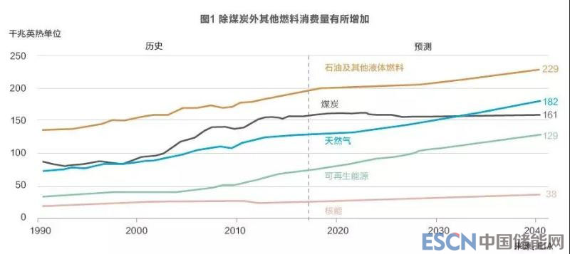 各機構預測,向更低碳的能源結構轉型將會持續(xù)。EIA認為,到2040年,世界范圍內,除煤炭外其他燃料消費量均呈增加態(tài)勢(見圖1)。
