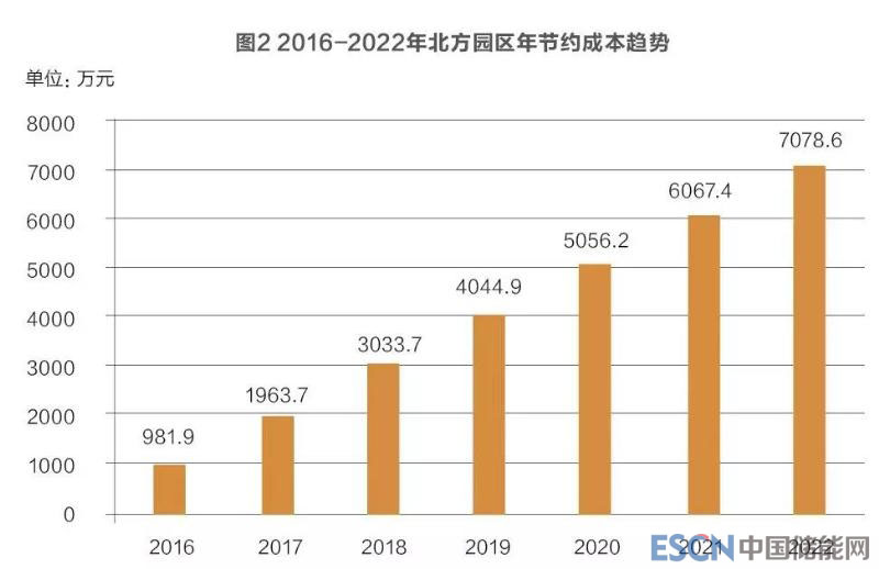 從節(jié)約成本角度看,按目前國網(wǎng)客服中心北方園區(qū)能源系統(tǒng)試運行數(shù)據(jù)計算,北方園區(qū)每年累計節(jié)約電量約1100.2萬千瓦時,年節(jié)約電費共計987.7萬元,預(yù)計到2020年將節(jié)約5056.2萬元,2022年節(jié)約7078.6萬元,具體見圖2。