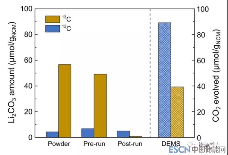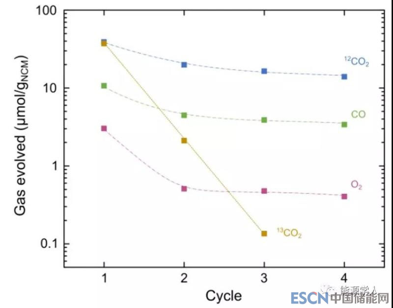 在本次試驗(yàn)中同位素標(biāo)記法證明了Li2CO3會(huì)產(chǎn)生CO2,但同時(shí)也證明了Li2CO3不是CO2的主要來(lái)源。在不考慮電解液氧化分解的條件下,NCM材料中逸出的氧原子與電解液反應(yīng)是電池中CO2的主要來(lái)源。