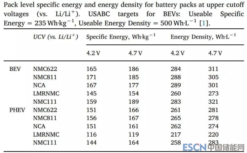 表5匯總了截止電壓分別為4.2V和4.7V時,純電動汽車和插電式混合動力汽車電池pack的比能量和能量密度。