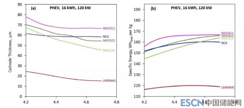 插電式混合動力汽車電池要求高功率,假定電池包16kWh,10s脈沖功率要求120kW(7.5C),較高的功率要求進(jìn)一步限制了極片厚度,如圖6(a)所示,811的極片厚度也需要降至80微米。在這些極片厚度設(shè)計下對應(yīng)的PACK比能量如圖6(b)所示,在較高的截止電壓下,PACK的比能量由高到低排序為NMC811 > NMC622 > NMC111 > NCA ? LMRNMC。