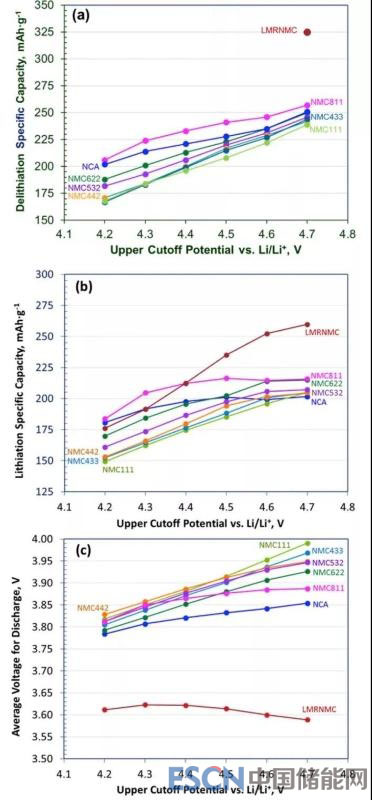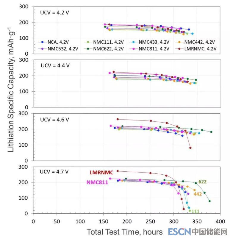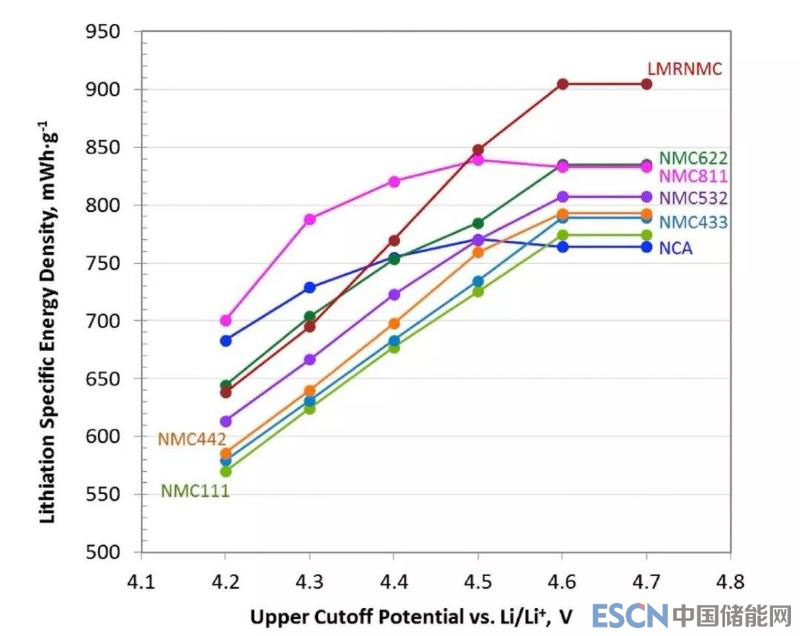其中,富鋰錳基,高鎳三元,鎳鈷鋁等正極成為開發(fā)高能量密度的首選正極材料,而且配合高壓電解液提高電池的充電截止電壓,從而提高電池能量密度。富鋰、NCA、811、622、532、442、433、111這些正極材料在不同截止電壓下性能到底如何呢?