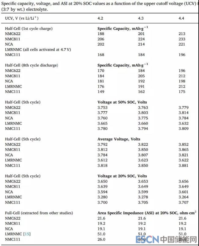 表3匯總列出了圖2的部分結(jié)果,包括第一次充電比容量,第八次放電比容量,第五次放電平均電壓。同時,列出了不同截止電壓下20%和50%SOC時的半電池電壓,以及從其他文獻(xiàn)獲取各種材料全電池在20%SOC時10s直流內(nèi)阻,直流內(nèi)阻大小可以體現(xiàn)電池功率特性,直流內(nèi)阻值越小功率越高。表中可見,不同截止電壓對直流內(nèi)阻影響不大,并且其值約為21ohm.cm2。