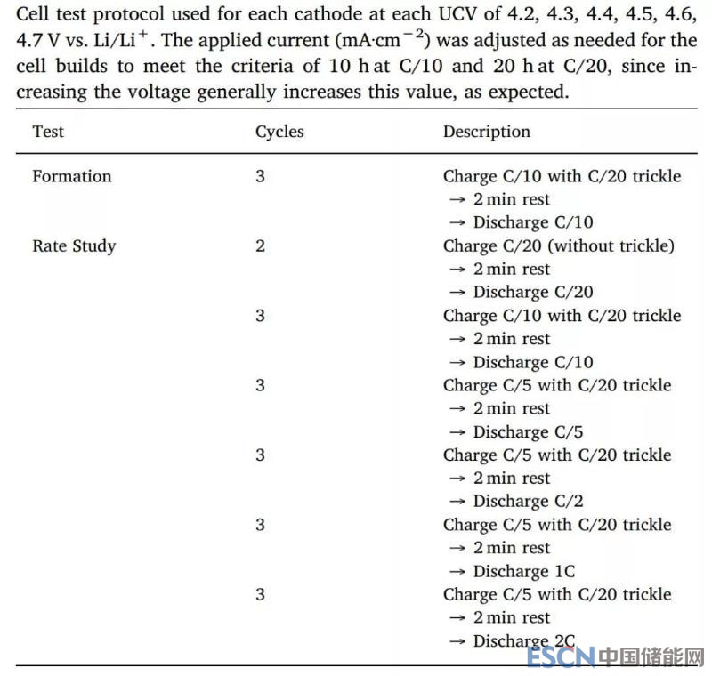 美國阿貢實驗室Ahmed專門對比研究了這些材料,各種正極材料做成的極片具體信息如表1所示,漿料配方和極片設(shè)計沒有優(yōu)化,然后把這些極片組裝成紐扣半電池,電解液為EC:EMC=3:7,1.2m LiPF6,無任何其他添加劑和溶劑。電池下截止電壓除了富鋰材料為2.5V,其他均為3.0V,分別對比了上截止電壓4.2,4.3,4.4,4.5,4.6,4.7V的各種性能,在每個截止電壓下電池進(jìn)行表2所示的充放電循環(huán),共20個循環(huán)。