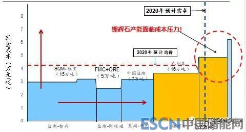 再來看產(chǎn)能產(chǎn)量的情況,到2020年產(chǎn)能預(yù)計(jì)在77萬噸左右,過去產(chǎn)能利用率在55%-60%之間,則產(chǎn)量在42-46萬噸左右。下圖是國金證券首席鈷鋰分析師廖淦做的一張到2020年全球鋰礦成本曲線圖,廖淦總在供給端的把握上是行業(yè)領(lǐng)先水平,其做的成本曲線圖可靠性高。