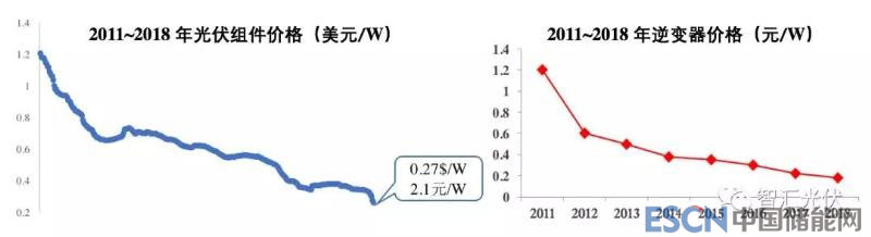 圖:2011~2018年光伏組件、逆變器的價(jià)格變化趨勢