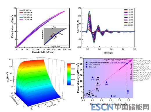 小型化和輕量化一直是儲能電容器的重要發(fā)展趨勢。為此,該團(tuán)隊(duì)聚焦尚無文獻(xiàn)報道的鈮酸鈉(NaNbO3)體系。NaNbO3的體積密度僅為4.55g/cm3,相比鐵酸鉍(8.37g/cm3)、鈦酸鋇(6.02g/cm3)、鈦酸鉍鈉 (5.977g/cm3)等其它無鉛介質(zhì)材料體系,它在儲能電容器的輕量化方面具有明顯的優(yōu)勢。然而,電場誘導(dǎo)的亞穩(wěn)態(tài)鐵電性和堿金屬鈉元素?fù)]發(fā)導(dǎo)致的耐電強(qiáng)度低制約了NaNbO3在儲能方面的應(yīng)用。該團(tuán)隊(duì)先后采用順電體調(diào)控和A位空位策略來增強(qiáng)NaNbO3的儲能特性,構(gòu)筑了兩種新型的NaNbO3基儲能介質(zhì)陶瓷材料:NaNbO3-SrTiO3和Na1-3xBixNbO3。這兩種NaNbO3基儲能介質(zhì)陶瓷材料均表現(xiàn)出了優(yōu)異的儲能特性、充放電特性及穩(wěn)定性,其中Na1-3xBixNbO3的綜合儲能特性(儲能密度:4.03J/cm3、儲能效率:85.4%、功率密度:62.5 MW/cm3)為目前文獻(xiàn)報道的最優(yōu)值。該工作為NaNbO3材料開辟了新的應(yīng)用方向,同時也為設(shè)計(jì)高儲能無鉛介質(zhì)材料提供了新的方法和思路。相關(guān)研究成果發(fā)表在Journal of Materials Chemistry A (J. Mater. Chem. A, 2018,6, 17896-17904)和ACS Sustainable Chemistry & Engineering (ACS Sustainable Chem. Eng. 2018, 6, 10, 12755-12765)上。