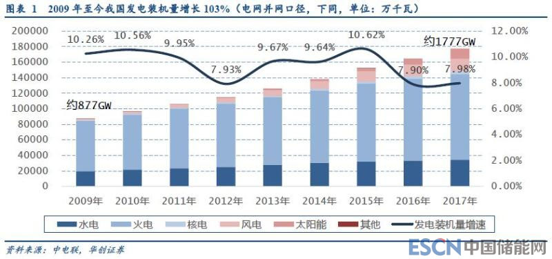 截至2017年底,我國發(fā)電裝機(jī)容量達(dá)到177703萬千瓦(約1777GW)。其中,火電裝機(jī)量1106GW、水電341GW、核電35.8GW、風(fēng)電163.7GW、太陽能發(fā)電130.3GW。2009年至今,我國發(fā)電裝機(jī)量增加了903GW,增長103%,其中新增火電裝機(jī)455GW,水電145GW,核電26GW,風(fēng)電146GW,光伏130GW。十年間,我國發(fā)電裝機(jī)總量增長103%,其中火電貢獻(xiàn)率50.4%,水、核、風(fēng)、光分別貢獻(xiàn)16.1%、2.8%、16.2%、14.4%。