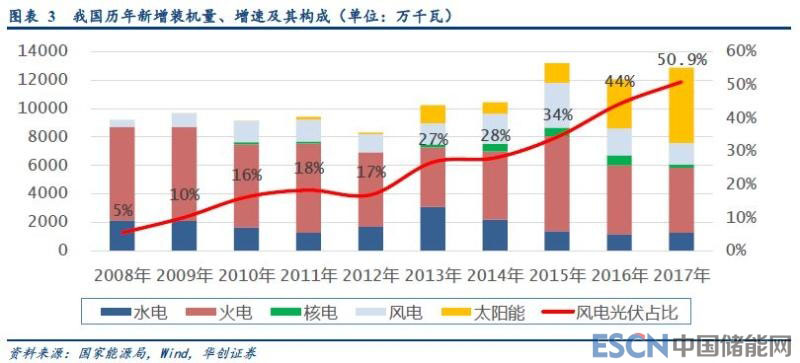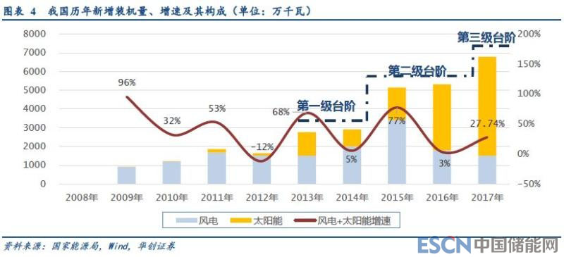 我國風(fēng)電、光伏年新增裝機(jī)總量已經(jīng)進(jìn)入到“第三級臺階”。從2013年,我國光伏裝機(jī)進(jìn)入規(guī)模化發(fā)展開始,我國風(fēng)電、光伏的新增發(fā)電裝機(jī)容量,歷了三個臺階。第一級是2013、2014年,光伏、風(fēng)電裝機(jī)量各有漲跌,但總量均逼近30GW。第二季臺階是2015、2016年,風(fēng)電、光伏先后搶裝,兩年的新增裝機(jī)總量均突破50GW。2017年,中東部地區(qū)分布式光伏裝機(jī)量大幅提高,風(fēng)電+光伏裝機(jī)總量逼近70GW,裝機(jī)總量達(dá)到“第三級臺階”,在新增裝機(jī)中的占比已達(dá)到50.9%。