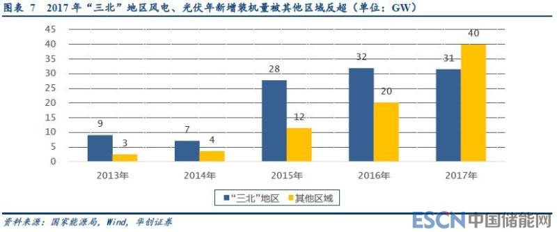 新能源發(fā)電裝機(jī)量開始向中東部地區(qū)轉(zhuǎn)移,2017年,三北地區(qū)之外的新能源裝機(jī)量。更多地集中在華東、華中。2017年,一方面“三北”地區(qū)受政策把控,新增風(fēng)電裝機(jī)量受到限制,另一方面,超過一半以上的分布式光伏更多的落地于中東部地區(qū)。因此,2017年的“第三級臺階”對電網(wǎng)的沖擊較為有限。