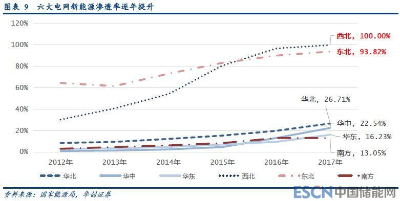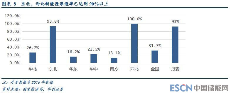 2017年底,東北、西北地區(qū)的新能源發(fā)電裝機(jī)量分別達(dá)到55GW、81GW。而2017年內(nèi),東北、西北地區(qū)最高用電負(fù)荷分別為59GW、81GW,新能源發(fā)電滲透率(新能源裝機(jī)量/最高電網(wǎng)負(fù)荷)分別達(dá)到94%、100%。2016年,丹麥、西班牙、葡萄牙的這一指標(biāo)分別為93%、78%、63%。按照2017年底的裝機(jī)量和年內(nèi)最大負(fù)荷情況看,東北、西北地區(qū)的新能源滲透率已經(jīng)達(dá)到與丹麥幾乎相同的水平。
