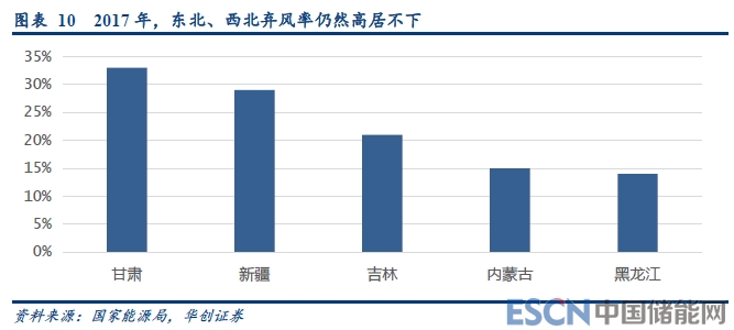 然而,東北、西北地區(qū)棄風(fēng)棄光率仍然較高。對電網(wǎng)調(diào)節(jié)影響更大的風(fēng)電,在2017年底東北、西北地區(qū)的裝機(jī)量分別達(dá)到了45GW、46GW,分別是全國風(fēng)電裝機(jī)總量的28%、27%。特別是東北地區(qū),風(fēng)電的滲透率高達(dá)76%。2015年開始,東北、西北地區(qū)風(fēng)電的無控制裝機(jī),對電網(wǎng)的沖擊可見一斑。2017年,東北、西北地區(qū)省份的棄風(fēng)率仍然高居不下。甘肅、新疆、吉林三省份的棄電率在20~35%之間不等。