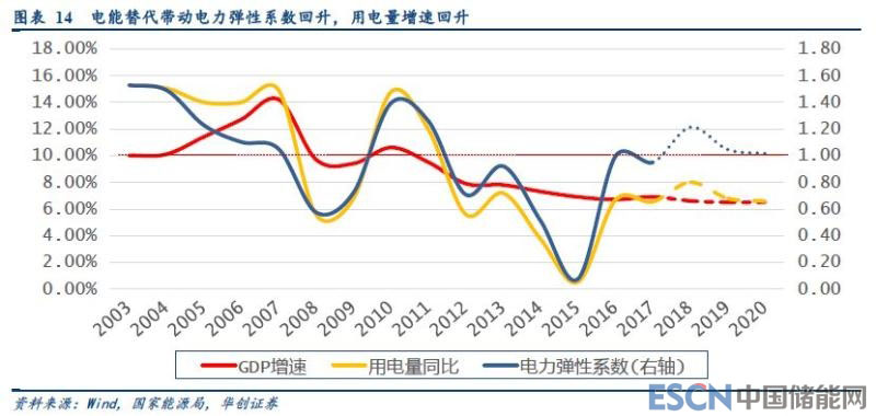 從電力消費(fèi)彈性系數(shù)來看(用電量增速與GDP增速比值),在經(jīng)過了2015年的增速低谷后,隨著供給側(cè)改革、電能替代等因素,2016年開始用電增速逐步恢復(fù)。在煤改電、新能源汽車、供給側(cè)改革等重大產(chǎn)業(yè)發(fā)展變化、政策引導(dǎo)下,我國終端電力消費(fèi)在能源消費(fèi)中的比例正在逐步提升。2017年,全社會用電量增量達(dá)到3905億千瓦時,其中電能替代電量超過1200億千瓦時,電能替代對用電量增量貢獻(xiàn)超過了30%。