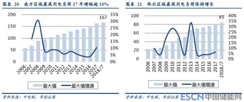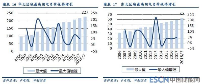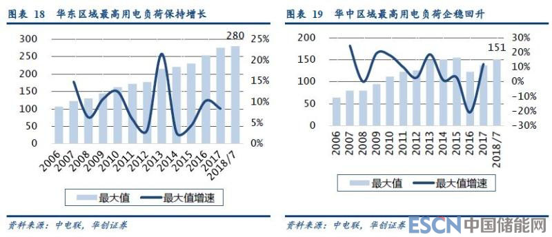 我國主要電網(wǎng)的最高用電負(fù)荷快速提高。2017年7月,我國主要電網(wǎng)的合計最大用電負(fù)荷達(dá)到了926GW,同比增長7.8%,除華中電網(wǎng)外,其他區(qū)域均創(chuàng)歷史新高,繼續(xù)維持5~10%的增速。2018年7月,全國主要電網(wǎng)的合計最大用電負(fù)荷達(dá)到993GW,同比增長7.2%,再創(chuàng)歷史新高。