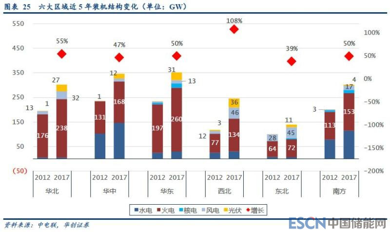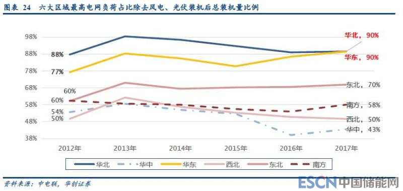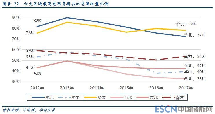 華東地區(qū)負(fù)荷壓力已經(jīng)凸顯。按照風(fēng)電、光伏的年利用小時數(shù)看,風(fēng)電的平均負(fù)荷率23%~30%,光伏僅為13%~16%,而火電、水電、核電平均負(fù)荷率水平分別為50%、40%、80%左右。同時,風(fēng)電、光伏的可調(diào)度性差,基本不具有向上的可調(diào)度備用能力。因此,在考慮電網(wǎng)可調(diào)度缺口壓力時,應(yīng)當(dāng)剔除風(fēng)電、光伏在裝機(jī)中的比例。我們扣除風(fēng)電、光伏的裝機(jī)量后發(fā)現(xiàn),華東、東北、華北地區(qū)在的這一指標(biāo)有所提高(見圖表24)。特別是華東地區(qū),2017年最高負(fù)荷在非新能源裝機(jī)量中的占比達(dá)到了90%,較2012年提高了12個百分點(diǎn),夏季調(diào)度壓力可見一斑。