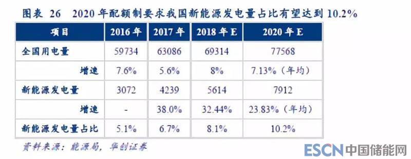 2020年,非水可再生能源發(fā)電量占比有望達(dá)到10.2%。2017年,我國用電總量63,086萬億千瓦時,其中新能源發(fā)電量4239萬億千瓦時,占比6.7%。以各省2017年的用電量為基礎(chǔ),按照2018年的配額指標(biāo)計算,全國總的指標(biāo)為8.1%;按照2020年的配額指標(biāo)計算,全國總的指標(biāo)為10.2%。我們假設(shè)2020年,我國非水可再生能源在全部用電量中的占比為10.2%,則2020年新能源發(fā)電量應(yīng)達(dá)到7912億千瓦時。