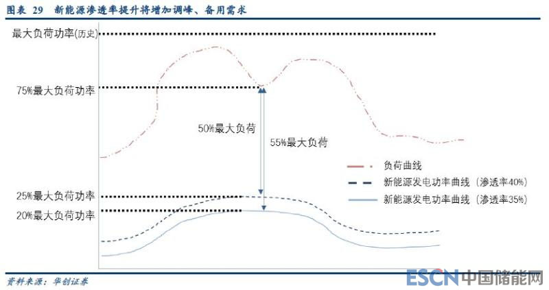 舉例來看,當(dāng)一個電網(wǎng)新能源發(fā)電裝機(jī)滲透率(新能源發(fā)電裝機(jī)容量/電網(wǎng)最大負(fù)荷)達(dá)到35%時,某日午時新能源發(fā)電功率可達(dá)到了20%的最大電網(wǎng)負(fù)荷(新能源發(fā)電功率達(dá)到了額定裝機(jī)容量的57%),其瞬時電網(wǎng)負(fù)荷功率為75%最大負(fù)荷功率,為了保障新能源的完全消納,傳統(tǒng)能源的發(fā)電僅有55%最大負(fù)荷的功率空間。也就是說,如果假設(shè)傳統(tǒng)電源額定裝機(jī)量是電網(wǎng)最大負(fù)荷的120%,那么此時傳統(tǒng)能源的功率只有額定功率的45%。