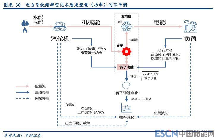 對于交流電系統(tǒng),頻率是重要的性能指標(biāo),電網(wǎng)頻率的過度變化對于發(fā)電側(cè)和用電側(cè)都有非常大的沖擊。同步發(fā)電機(jī)是電力系統(tǒng)的主要電源形式,其轉(zhuǎn)子轉(zhuǎn)速與發(fā)電頻率密切相關(guān)。當(dāng)轉(zhuǎn)子的輸入能量(機(jī)械能)與輸出能量(電磁能)不一致時,就會影響其自身的動能,造成了轉(zhuǎn)速變化,進(jìn)而改變了交流電頻率。電網(wǎng)頻率變化實(shí)際上是電網(wǎng)發(fā)、用電功率不平衡累計的結(jié)果。