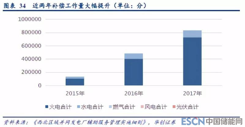 補(bǔ)償費(fèi)用規(guī)模增長了百倍級別,輔助服務(wù)(備用、調(diào)峰)工作量大幅提高。2015年10月之前,新疆省的水電、火電獲得的全部補(bǔ)償費(fèi)用不足500萬元/月,10月份按照新標(biāo)準(zhǔn)后,總補(bǔ)償費(fèi)用規(guī)模達(dá)到了3500萬元/月。為了避免補(bǔ)償標(biāo)準(zhǔn)提升的影響,我們對比了2015~2017年新疆省輔助服務(wù)分類主體的總補(bǔ)償分?jǐn)?shù),發(fā)現(xiàn)近兩年補(bǔ)償分?jǐn)?shù)每年都有翻倍增長的趨勢,這樣就意味著新疆地區(qū)輔助服務(wù)的工作量有了非常大的提升。毋庸置疑,新疆的輔助服務(wù)工作量占比最高的就是備用與調(diào)峰輔助服務(wù),這些服務(wù)都為風(fēng)電、光伏發(fā)電出讓了大量發(fā)電空間。