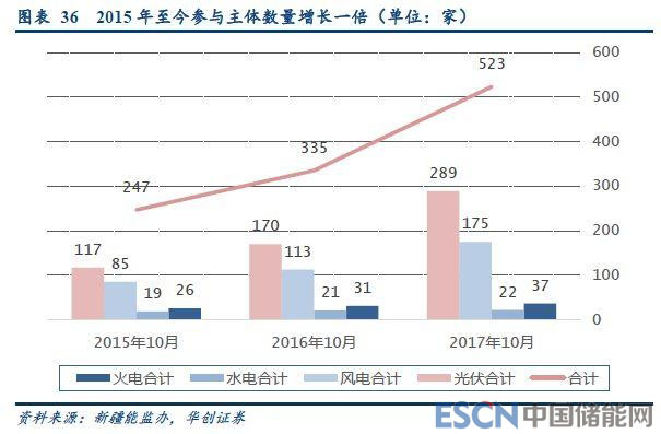 2015年~2017年風(fēng)電、光伏主體數(shù)量大增,分別增長105%、147%。從數(shù)據(jù)來看,2015~2017年三年的10月份,參與考核補(bǔ)償?shù)幕痣姀S個數(shù)分別為26、31、37座;水電廠分別為19、21、22座,風(fēng)電場85、113、175座;光伏117、170、289座,火電廠數(shù)量增長了42%,水電15%,風(fēng)電105%,光伏147%??梢园l(fā)現(xiàn),新疆參與電力輔助服務(wù)的光伏、風(fēng)電廠數(shù)量有了翻倍的增長。