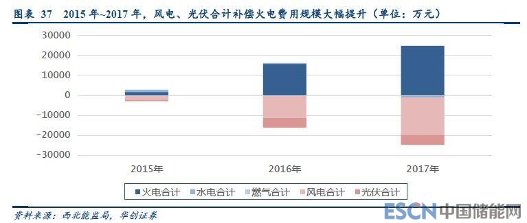 我們對比了2015~2017年1~10月新疆省的結(jié)算費(fèi)用(結(jié)算費(fèi)用=補(bǔ)償費(fèi)用-考核費(fèi)用-分?jǐn)傎M(fèi)用)總規(guī)模,從整體來看可以發(fā)現(xiàn)風(fēng)電、光伏為上繳費(fèi)用(負(fù)值),并且上繳費(fèi)用逐年提升,2017年的總結(jié)算費(fèi)用規(guī)模達(dá)到了2.48億元。從這一角度看,風(fēng)電光伏納入補(bǔ)償體系后,電力輔助服務(wù)成為了新能源補(bǔ)償火電、水電調(diào)節(jié)電網(wǎng)平衡的機(jī)制橋梁,實(shí)現(xiàn)了新能源發(fā)電對參與調(diào)節(jié)的火電、水電發(fā)電主體的補(bǔ)償,實(shí)際效果上看是新能源“購買”火電、水電的調(diào)節(jié)服務(wù)。所以火電、水電參與市場調(diào)節(jié)的服務(wù)積極性獲得了大幅提高。