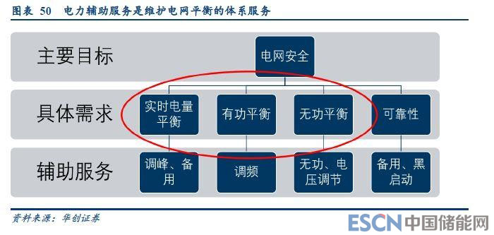 電網(wǎng)的功率平衡問題是電網(wǎng)安全的核心,也是輔助服務(wù)的主要工作內(nèi)容。具體來看,電力輔助服務(wù)解決了系統(tǒng)的四方面需求:1、實(shí)時電量平衡;2、有功功率平衡;3、無功功率平衡;4、電網(wǎng)可靠性。其中,前三項是保證電網(wǎng)平衡的具體需求,依靠電力輔助服務(wù)中的調(diào)峰、調(diào)頻、調(diào)壓、無功補(bǔ)償?shù)确绞浇鉀Q的,這一需求占據(jù)了輔助服務(wù)90%以上的日常工作。此外,電網(wǎng)安全還包括可靠性、故障恢復(fù)的需求,這些由輔助服務(wù)中的備用、黑啟動等項目保證。