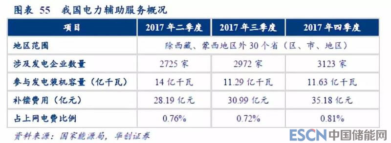 2017年11月開始,國家能源局先后公布了2017年第二、第三、第四季度的全國輔助服務(wù)補(bǔ)償情況通報,除西藏、蒙西地區(qū)外的30個省均已建立起了電力輔助服務(wù)機(jī)制。補(bǔ)償費(fèi)用在上網(wǎng)電費(fèi)比例達(dá)到了0.7~0.8%左右,我們估計目前全國每年的電力輔助服務(wù)補(bǔ)償費(fèi)用在110~125億元之間。
