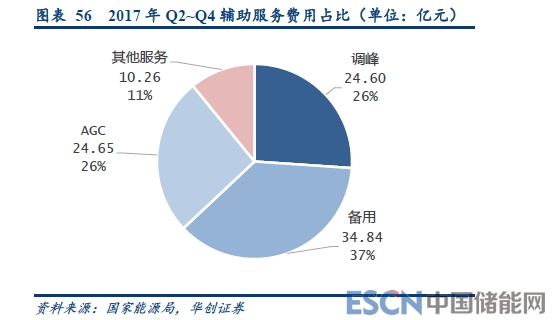 我國備用服務(wù)、調(diào)峰服務(wù)、自動發(fā)點(diǎn)控制(AGC,二次調(diào)頻)是我國電力輔助服務(wù)最主要的品種。在我國,電力輔助服務(wù)中并不是所有服務(wù)均予以補(bǔ)償,統(tǒng)計中的調(diào)峰、備用分別指的是有償調(diào)峰、旋轉(zhuǎn)備用,而基本調(diào)峰、非旋轉(zhuǎn)備用并不給予補(bǔ)償,屬于發(fā)電廠的基本“發(fā)電義務(wù)”。從公布的兩個季度的輔助服務(wù)補(bǔ)償費(fèi)用來看,備用服務(wù)費(fèi)用占比37%、調(diào)峰26%、AGC 26%。