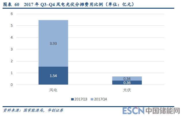 目前,全國范圍的風(fēng)電、光伏已經(jīng)被納入到了輔助服務(wù)補(bǔ)償體系內(nèi)。除去光伏、風(fēng)電自身需承擔(dān)的考核費(fèi)用外,還需要按照自身的發(fā)電量比例參與分?jǐn)傒o助服務(wù)補(bǔ)償費(fèi)用。根據(jù)能源局公布的數(shù)據(jù),2017年第三、第四季度,風(fēng)電光伏合計承擔(dān)的分?jǐn)傎M(fèi)用為1.9億元、4.27億元,分別占對應(yīng)季度發(fā)電機(jī)組分?jǐn)傎M(fèi)用的7.6%、15%。從實(shí)際效果上看,實(shí)現(xiàn)了新能源發(fā)電“購買”火電、水電等機(jī)組調(diào)峰、備用服務(wù)的效果。