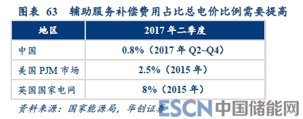 與國外相比,我國電力輔助服務(wù)起步較晚,補(bǔ)償力度明顯較低。2015年美國PJM電力市場的輔助服務(wù)費(fèi)用占比電量費(fèi)比例為2.5%(可再生能源裝機(jī)占比為5%),同年英國這一數(shù)值高達(dá)8%(可再生能源比例27%)。電力輔助服務(wù)是電網(wǎng)穩(wěn)定運(yùn)行的成本,當(dāng)電網(wǎng)受到的沖擊越來越多時,這一成本應(yīng)當(dāng)進(jìn)一步抬高,才能夠有效地刺激出足夠的可調(diào)用資源。