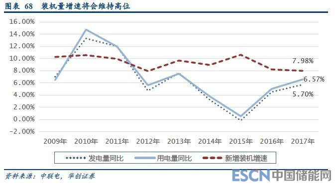 首先,我國用電量正在進(jìn)入一輪經(jīng)濟(jì)增長疊加電能替代帶動下的快速增長通道,未來三年的負(fù)荷增速在7.5%以上。同時,電網(wǎng)最大負(fù)荷也將以6%~8%左右的增速保持增長,裝機(jī)需求仍然較大。考慮到風(fēng)電、光伏的平均負(fù)荷率較火電低40%以上,同等用電量下的裝機(jī)量將遠(yuǎn)高于火電裝機(jī)。整體來看,我國未來三年將保持120GW左右年均新增發(fā)電裝機(jī)量。而考慮到配額制的約束,新能源年均新增裝機(jī)量也將有望保持70GW左右的水平。