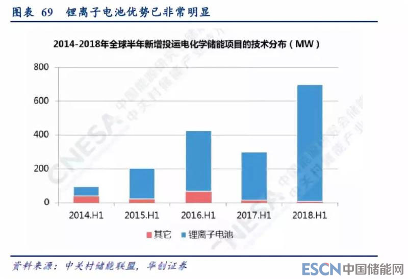 電網(wǎng)側(cè)、輔助服務(wù)領(lǐng)域儲能爆發(fā),對鋰離子電池需求的邊際帶動快速提高。根據(jù)中關(guān)村儲能產(chǎn)業(yè)技術(shù)聯(lián)盟的統(tǒng)計,2018年上半年,全球新增的697MW電化學(xué)儲能裝機(jī)中,幾乎全部為鋰離子電池。同時,輔助服務(wù)已成為全球最主要的電化學(xué)儲能應(yīng)用領(lǐng)域,達(dá)到354MW,占比51%,同比增長344%,并且全部為鋰離子電池,電網(wǎng)側(cè)儲能裝置也全部為鋰離子電池。上半年,我國電化學(xué)儲能項目新增裝機(jī)量達(dá)到100.4MW,同比增長127%,累計裝機(jī)規(guī)模達(dá)到490MW。其中,超過六成項目為電網(wǎng)級的電網(wǎng)側(cè)、輔助服務(wù)領(lǐng)域儲能,并且全部為鋰離子電池。