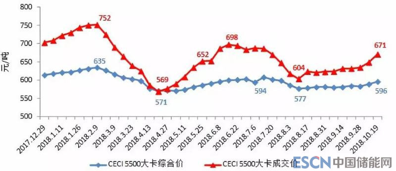 中電聯(lián)發(fā)布的《2018年前三季度全國電力供需形勢分析預測報告》顯示:前三季度,電煤價格總體處于高位波動態(tài)勢,根據(jù)中國沿海電煤采購價格指數(shù)——CECI沿海指數(shù)顯示,反映電煤采購綜合成本的CECI5500大卡綜合價前三季度波動區(qū)間為571-635元/噸,各期價格都超過了《關(guān)于平抑煤炭市場價格異常波動的備忘錄》中規(guī)定的綠色區(qū)間上限,國內(nèi)煤價持續(xù)高位也導致對標國內(nèi)煤價的進口煤價格快速上漲,明顯提高了國內(nèi)企業(yè)采購成本。