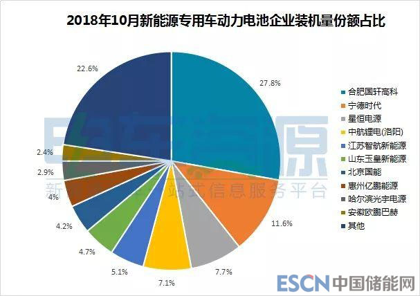 在10月新能源專用車動(dòng)力電池裝機(jī)量排行中,與以往不同的是,寧德時(shí)代不再占據(jù)榜首,從9月39%的占比跌落至11.6%,而以往排名在后的合肥國軒高科從8%一躍至27.8%,以絕對(duì)的優(yōu)勢登上冠軍寶座,并與寧德時(shí)代拉開了一定差距,相差1倍之多,占據(jù)了10月新能源專用車動(dòng)力電池裝機(jī)量的近3成份額。