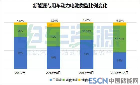 與2018年9月相比,磷酸鐵鋰動(dòng)力電池環(huán)比增長76.6%,占比比例由35.1%上升至57.5%,升幅明顯。而三元鋰則降幅明顯,占比比例由63%下降至36%。與2017年相比,三元鋰占比下降了33%,磷酸鐵鋰則呈現(xiàn)持續(xù)上升的趨勢,錳酸鋰占比也有所上升。