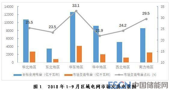 2018年1-9月,國家電網(wǎng)區(qū)域市場交易電量規(guī)模10874億千瓦時,占全國市場交易電量的75.2%,市場交易電量占其該區(qū)域全社會用電量的26.8%;南方電網(wǎng)區(qū)域市場交易電量規(guī)模2680億千瓦時,占全國市場交易電量的18.5%,市場交易電量占該區(qū)域全社會用電量的31.4%;蒙西電網(wǎng)區(qū)域市場交易電量規(guī)模903億千瓦時,占全國市場交易電量的6.2%,市場交易電量占該區(qū)域全社會用電量的47.3%。