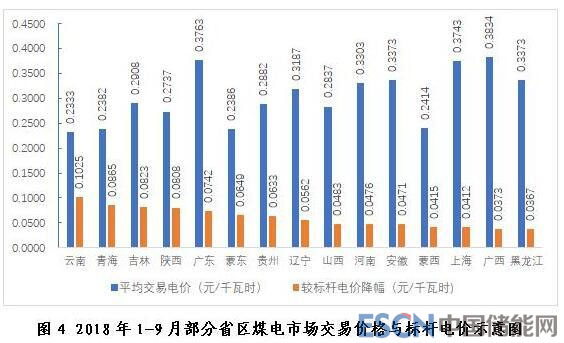 從分省煤電交易價格來看,與標(biāo)桿電價比較降幅最大的是云南,其市場交易平均電價為0.2333元/千瓦時,與標(biāo)桿電價相比降幅0.1025元/千瓦時,其次為青海、吉林、陜西、廣東,其交易平均電價分別為0.2382元/千瓦時、0.2908元/千瓦時、0.2737元/千瓦時、0.3763元/千瓦時,較標(biāo)桿電價降幅均超過0.07元/千瓦時。