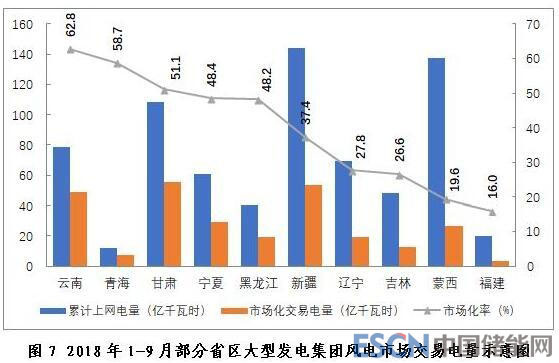 2018年1-9月,大型發(fā)電集團風(fēng)電機組累計上網(wǎng)電量1331億千瓦時,占其總上網(wǎng)電量的4.8%;風(fēng)電市場交易電量297億千瓦時,市場化率為22.3%,其中跨區(qū)跨省交易電量約131億千瓦時,占其市場交易電量比重44%。