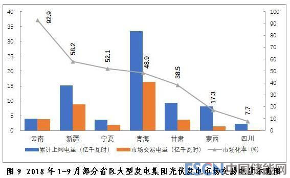 2018年1-9月,大型發(fā)電集團光伏發(fā)電累計上網(wǎng)電量249億千瓦時,占其總上網(wǎng)電量的0.9%;市場交易電量64億千瓦時,市場化率為25.7%,其中跨區(qū)跨省交易電量14.5億千瓦時,占其市場交易電量的22.7%。