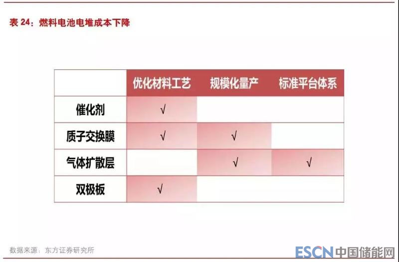 原材料價格昂貴或工藝不完善的部件,例如催化劑、質(zhì)子交換膜、雙極板等可以通過優(yōu)化制造材料改進(jìn)制備工藝的方式降低成本,現(xiàn)有技術(shù)已經(jīng)較完善的部件可通過建立標(biāo)準(zhǔn)化平臺化的產(chǎn)品體系并利用規(guī)模化生產(chǎn)的效應(yīng)有效建立成本優(yōu)勢。