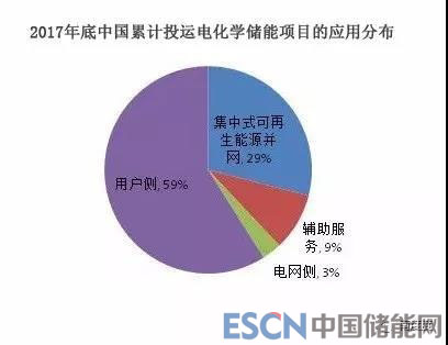 根據(jù)不完全統(tǒng)計,截至2017年底,中國已投運(yùn)儲能項目累計裝機(jī)規(guī)模28.9GW,同比增長19%,其中,抽水蓄能占比最大,接近99%,其次是電化學(xué)儲能裝機(jī)規(guī)模,達(dá)到389.8MW,同比增長45%。從中國新增投運(yùn)的電化學(xué)儲能項目的應(yīng)用分布上看,2017年,用戶側(cè)領(lǐng)域的新增裝機(jī)規(guī)模所占比重最大,為59%;其次是集中式可再生能源并網(wǎng)領(lǐng)域,所占比重接近25%;然后是輔助服務(wù)領(lǐng)域,占比9%;電網(wǎng)側(cè)占比3%。目前我國儲能運(yùn)用比較活躍的領(lǐng)域主要包括用戶側(cè)、可再生能源并網(wǎng)以及輔助服務(wù)三大板塊,電網(wǎng)側(cè)儲能今年開始發(fā)力。