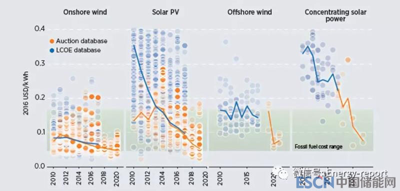 最近的拍賣和投標(biāo)結(jié)果表明,太陽能光伏和陸上風(fēng)電的成本將繼續(xù)下降,平準(zhǔn)化度電成本將在0.03~0.04美元/千瓦時之間,到2020年甚至更低。b光熱發(fā)電(CSP)和海上風(fēng)電都是新興技術(shù),2016年和2017年的拍賣結(jié)果(未來交付)為0.06美元/千瓦時~0.10美元/千瓦時。
