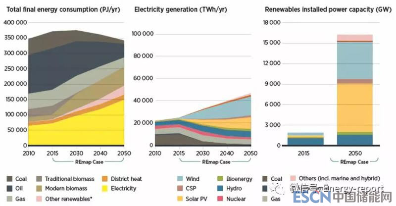 圖1.2 國際可再生能源署2050年路線圖中能源消費,發(fā)電量及可再生能源電力裝機(jī)容量